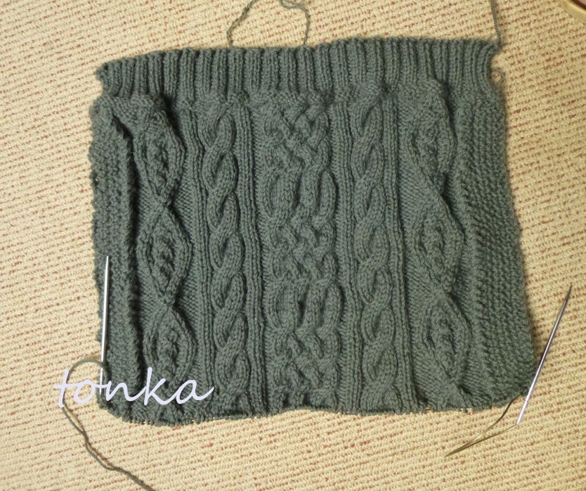 W tym momencie,przyznaję,miałam go już serdecznie dość.A tu jeszcze rękawy no i ten nieszczęsny kaptur.Zmobilizowałam się jednak bo miał to być prezent pod choinkę.Nawet szybko mi poszło,tym razem -o!cudzie!-bez prucia:))W sumie te wszystkie przeplatańce dość fajnie się robi bo robótka nie jest nudna i widać jak przybywa.Zdążyłam ze swetrem ,nie zdążyłam z kapturem.